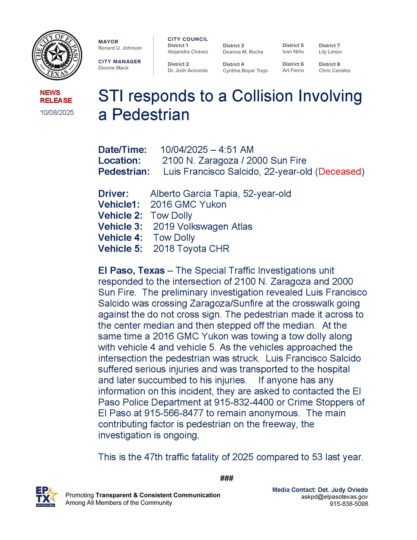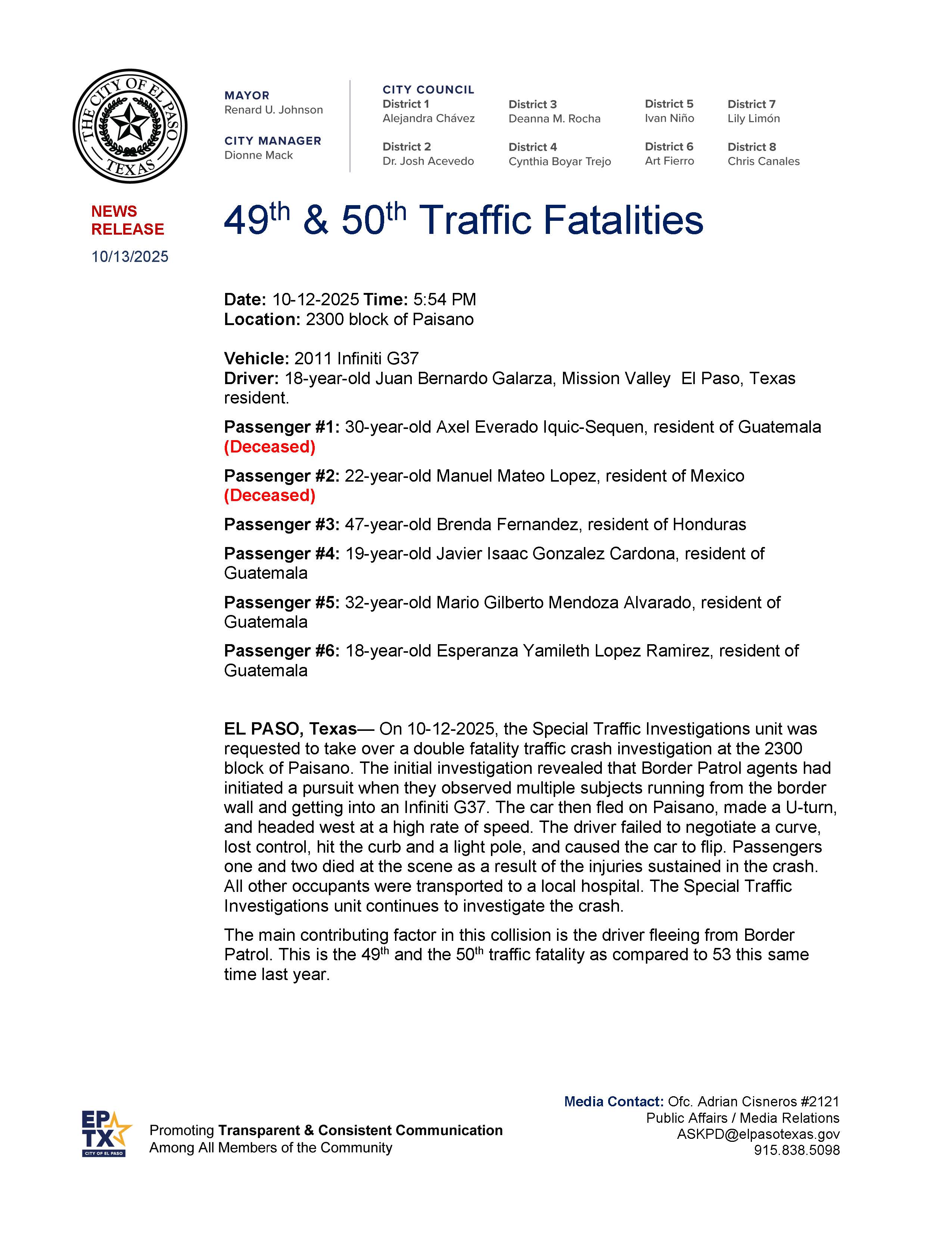 On 10-12-2025, the Special Traffic Investigations unit was requested to take over a double fatality traffic crash investigation at the 2300 block of Paisano...