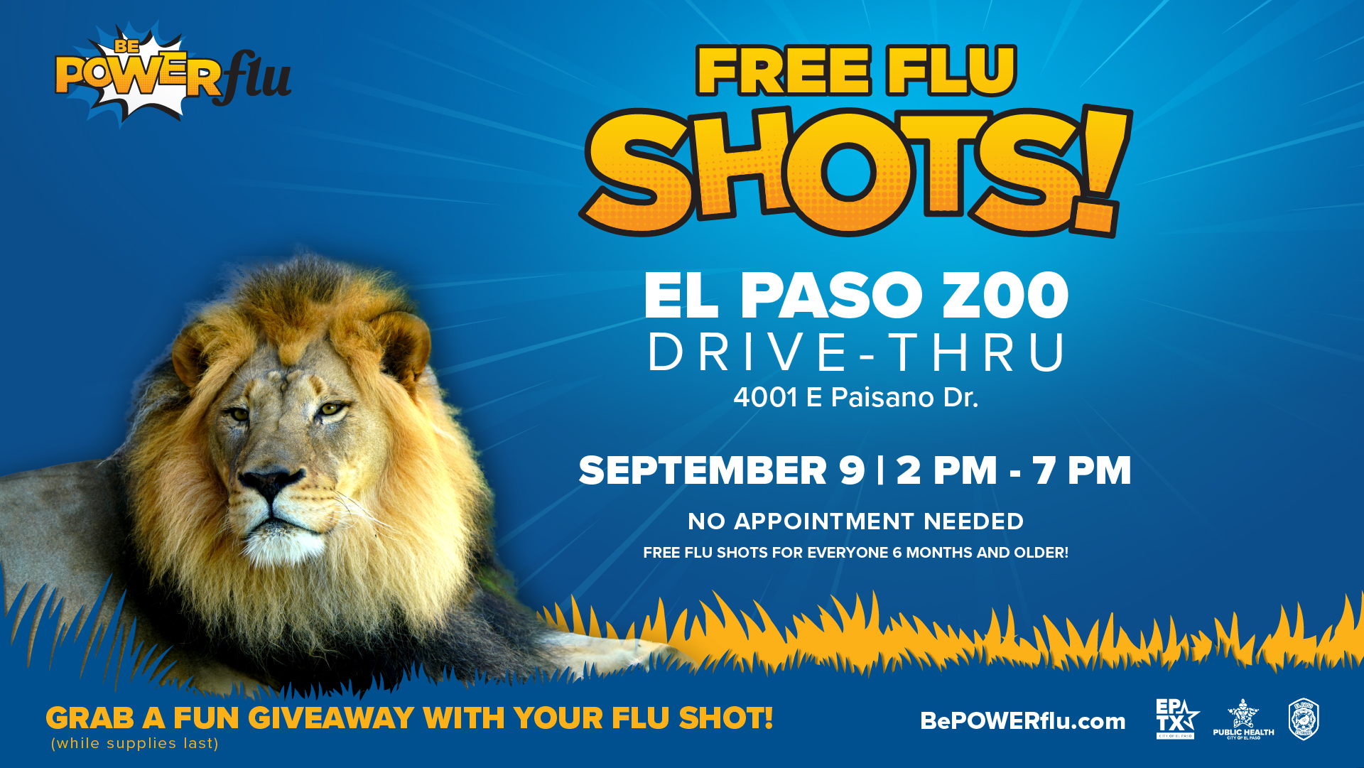 The City of El Paso Department of Public Health, in partnership with the El Paso Fire Department, invites the community to a FREE drive-thru flu vaccination event from 2 to 7 p.m. Tuesday, September 9, at the El Paso Zoo, 4001 E. Paisano Drive.