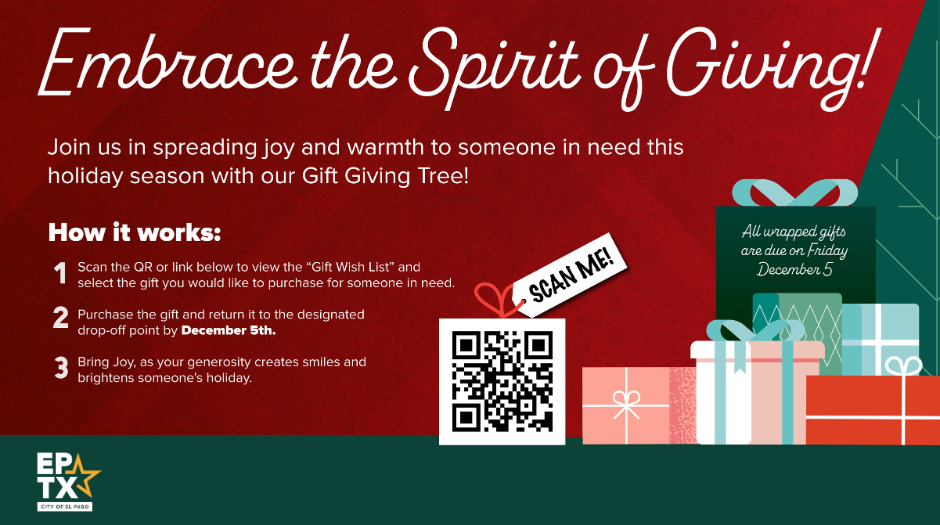 The City of El Paso invites residents to share the spirit of the season by participating in the Virtual Gift Giving Tree and helping spread holiday cheer to those in need.